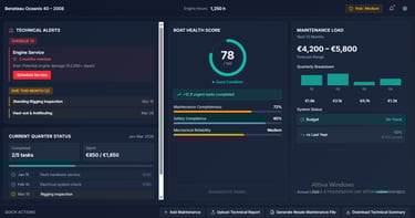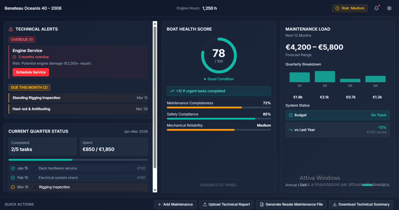 Il sistema genera automaticamente un piano 12 mesi basato su: tipo di barca, età, motore, storico. Sai esattamente cosa fare e quando.